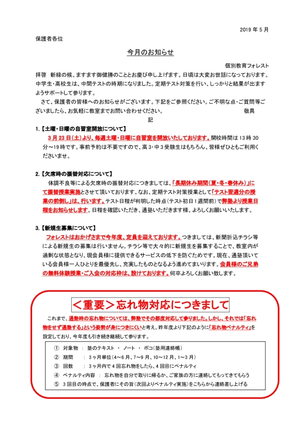 今月のお知らせ(2019年5月)