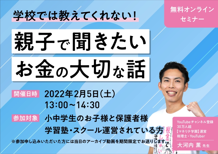 日程は2月5日(土)13:00~14:30、テーマは「学校では教えてくれない!親子で聞きたいお金の大切な話」です。