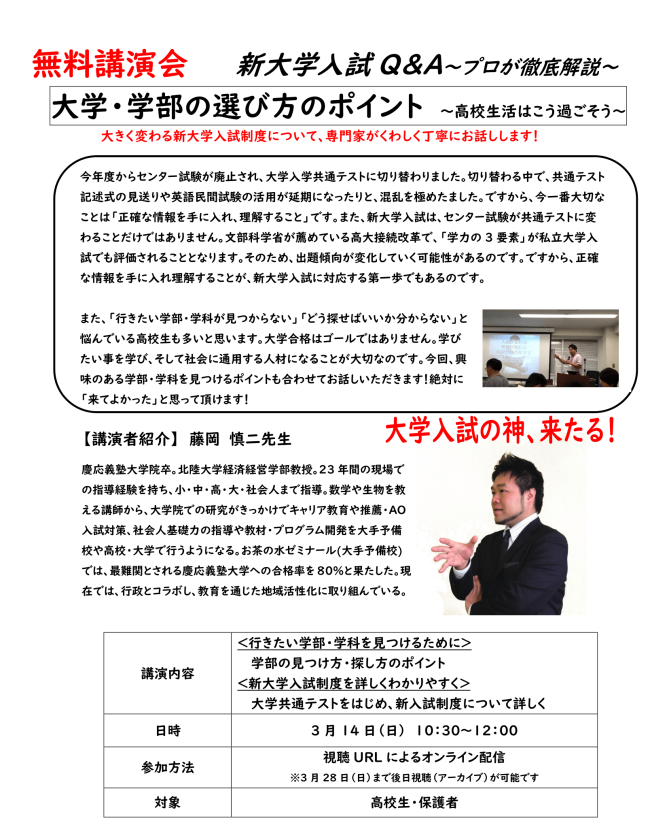 <無料講演会(第1弾)3月14日>大学・学部の選び方のポイント〜高校生活はこう過ごそう〜