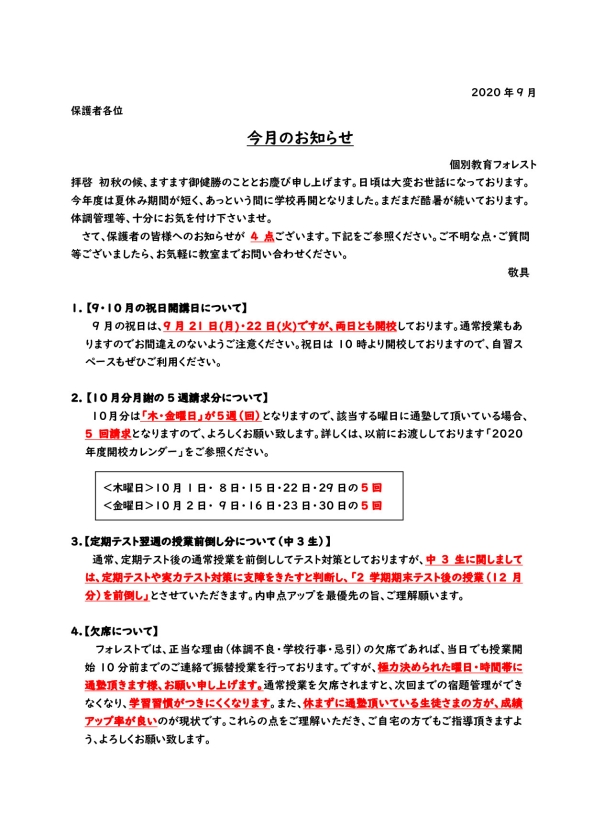 今月のお知らせ(2020年9月)