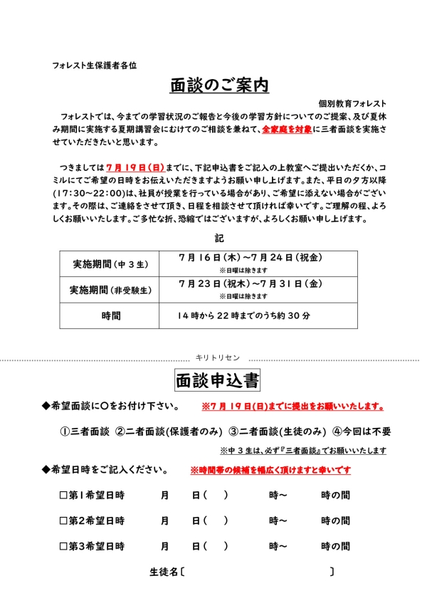 夏期面談のご案内