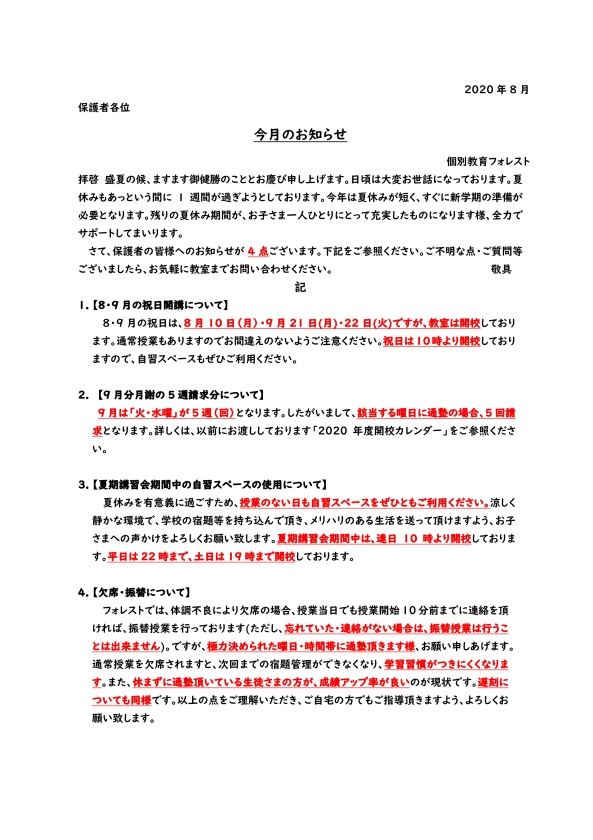 今月のお知らせ(2020年8月)