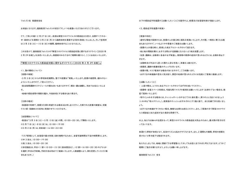 これを受けて、個別教育フォレストの『新型コロナウイルス感染症対策に関するガイドライン〔2020年2月29日版〕』を決定いたしました。