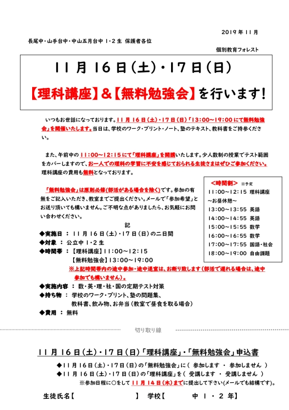 【中1・2生】無料勉強会のお知らせ