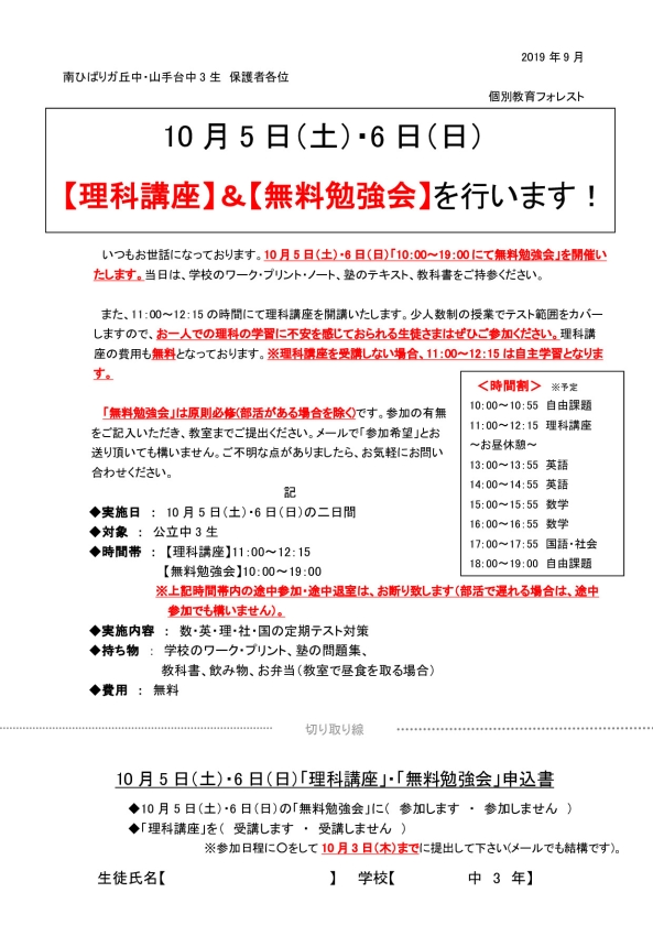 【山手台・南ひばりガ丘中3生】無料勉強会のお知らせ