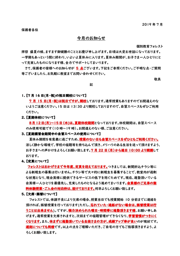 今月のお知らせ(2019年7月)