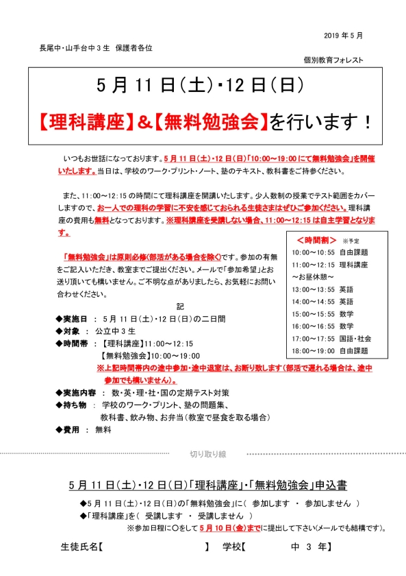 【長尾中3生】無料勉強会のお知らせ(5月11日・12日)