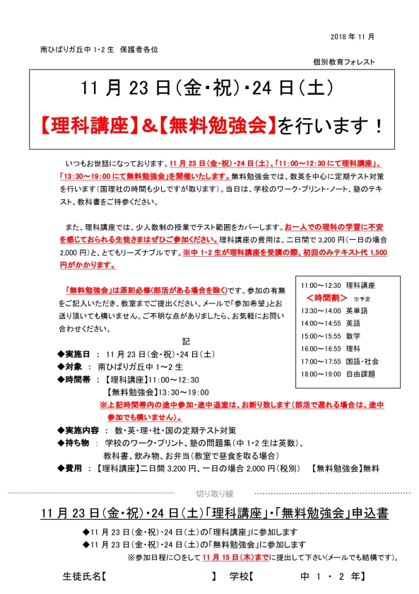 いつもお世話になっております。11月23日(金・祝)・24日(土)、「11:00~12:30にて理科講座」、「13:30~19:00にて無料勉強会」を開催いたします。無料勉強会では、数英を中心に定期テスト対策を行います(国理社の時間も少しですが取ります)。当日は、学校のワーク・プリント・ノート、塾のテキスト、教科書をご持参ください。
