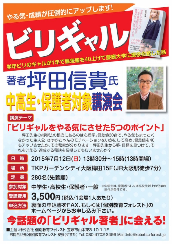 【ビリギャル講演会】一般生の受付始めました(10名様限定) 2015年06月30日(火) フォレストが主催する「ビリギャル著者・坪田先生」の講演会(7月12日・大阪梅田)を、一般の方にも聞いていだけるよう10席限定でご用意させていただきました。費用は一人3500円(税込)です。ご興味のある方は、コチラ からお申し込みください。 Tweets by kobetsu_forest