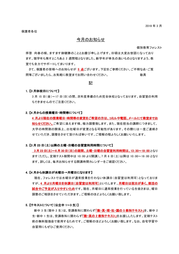 今月のお知らせ(2019年3月)