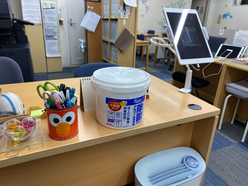 教室入口にアルコールタオル