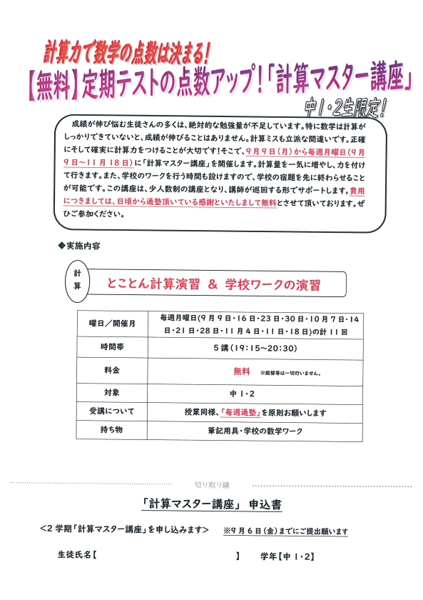 計算マスター講座のお知らせ(中1・2)