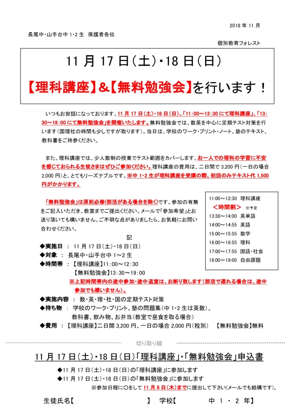 いつもお世話になっております。11月17日(土)・18日(日)、「11:00~12:30にて理科講座」、「13:30~19:00にて無料勉強会」を開催いたします。無料勉強会では、数英を中心に定期テスト対策を行います(国理社の時間も少しですが取ります)。当日は、学校のワーク・プリント・ノート、塾のテキスト、教科書をご持参ください。