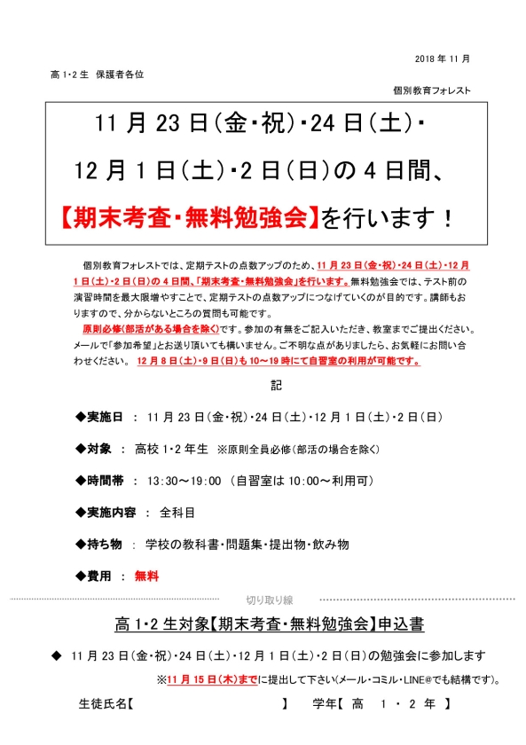 高1・2生【期末考査・無料勉強会】のお知らせ(11月23日・24日・12月1日・2日)