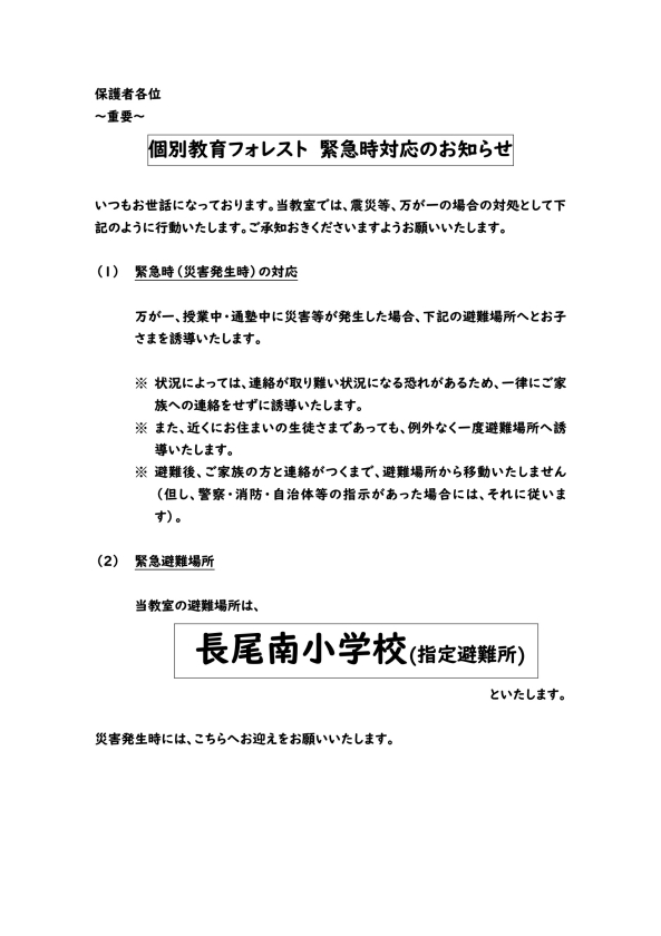 なお、フォレストでは、緊急時に下記の対応を行います。再度ご確認いただければ幸いです。