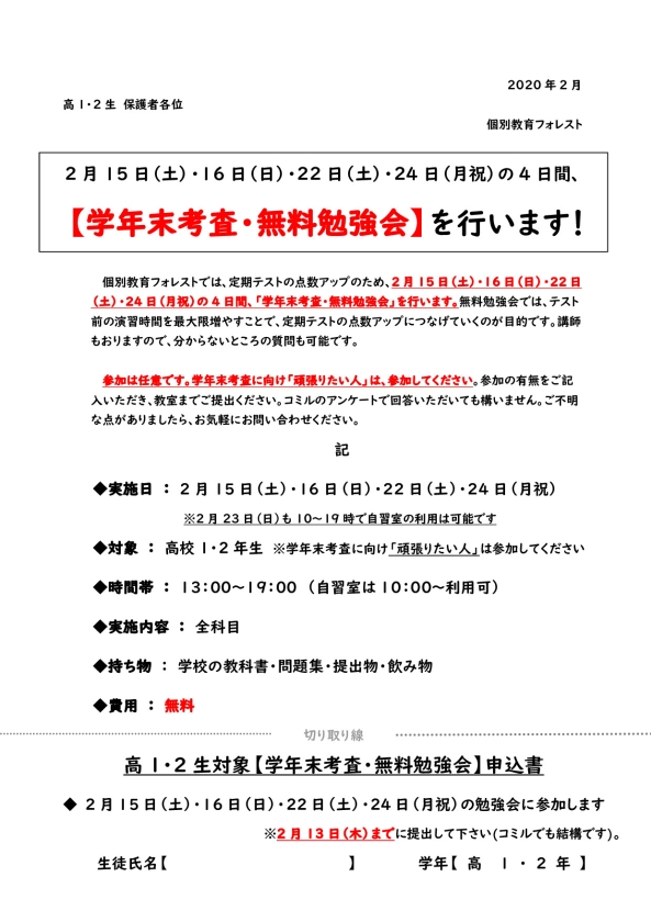 【高1・2生対象】無料勉強会のお知らせ(2月15日・16日・22日・24日)