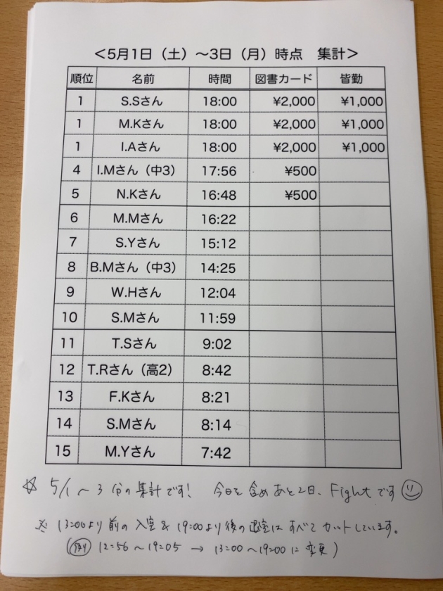 GW期間、自習ランキング(5月1日〜3日分、途中集計)