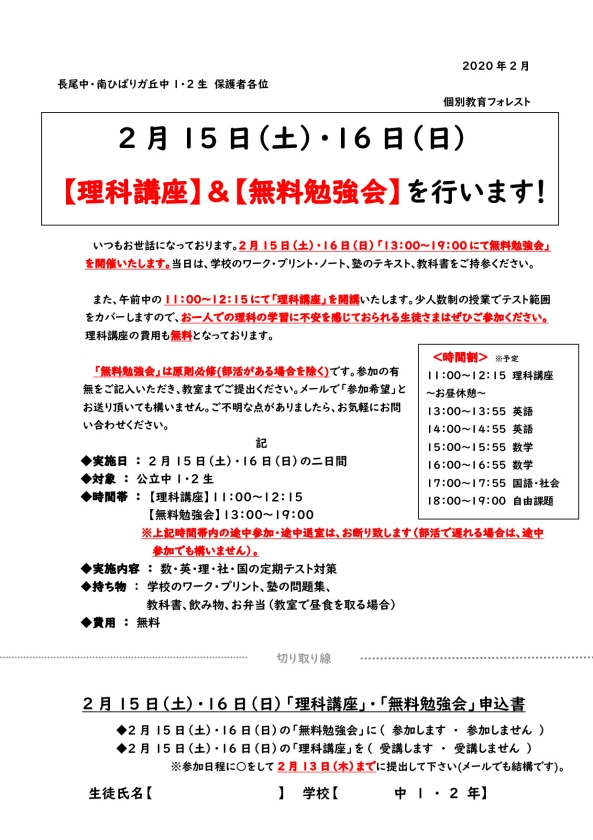 【長尾・南ひばりガ丘中1・2生対象】理科講座・無料勉強会のお知らせ(2月15日・16日)