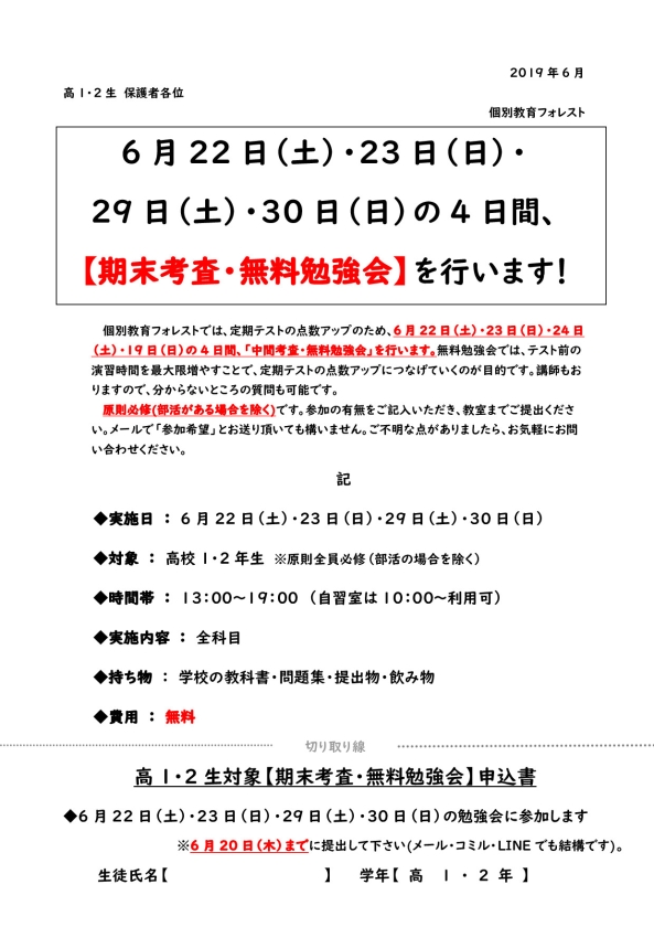 【高1・2生】無料勉強会のお知らせ(6月22日・23日・29日・30日)