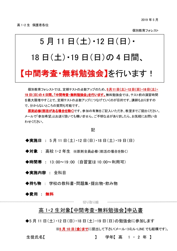 【高1・2生】無料勉強会のお知らせ(5月11日・12日・18日・19日)