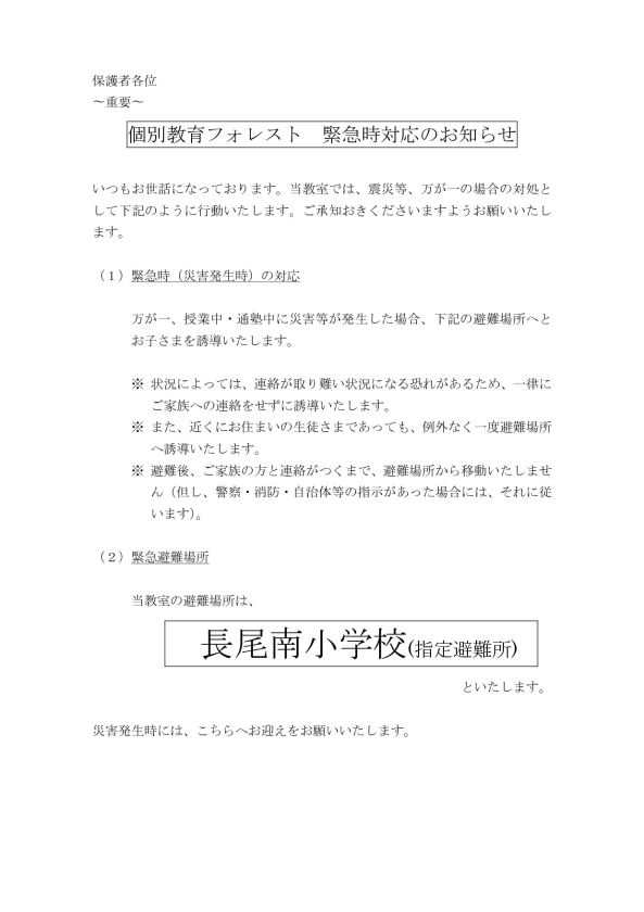 なお、当教室の避難場所は、長尾南小学校(指定避難所)といたします。
